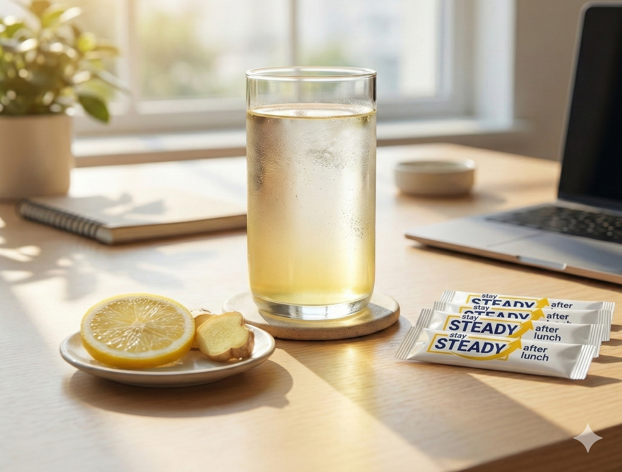 STEADY is a pre-lunch drink mix built around selected dietary fibers (psyllium, beta-glucan concentrate, acacia fiber). You take it before lunch as part of your routine - especially if you often notice an after-lunch crash or mid-afternoon dip. Many people try to manage those dips with coffee or sugar; STEADY is designed to be a no-caffeine alternative.